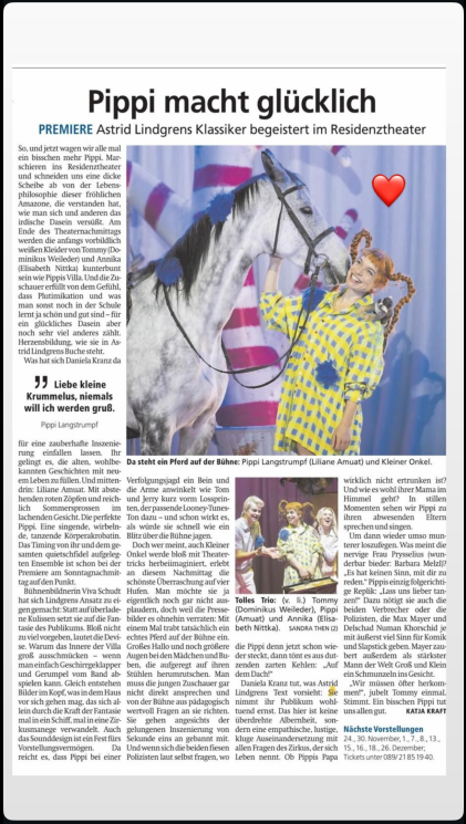 Die von uns gezüchtete "Irmi" (Irma La Douce), die sich inzwischen im Eigentum der Film-Tier (Barbara Zimmermann) befindet, hatte im November einen Auftritt im Münchner Residenztheater in Astrid Lindgrens „Pippi Langstrumpf“ (tz, merkur).