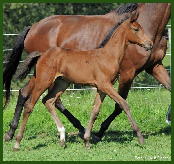 Unsere Diamant-Tochter Apfelsine, die ihrem berühmten Vater immer ähnlicher wird, überraschte uns mit einem hochedlen, charmanten Stutfohlen, das zudem im Körperbau an die großen Partien ihres Vaters erinnert. Sie bewegt sich federleicht in underschöner Selbsthaltung. In sportlicher Hinsicht ein tolle Blutführung, denn die seltenen Leistungsgene des Diamant verbinden sich bei ihr mit dem in dieser Hinsicht abgesicherten Pedigree des Vaters. Aus ihrem mütterlichen Stamm der Arcona ist in naher Verwandtschaft der Reitpferdechampion und begehrte junge Vererber Amadelio hervorgegangen.